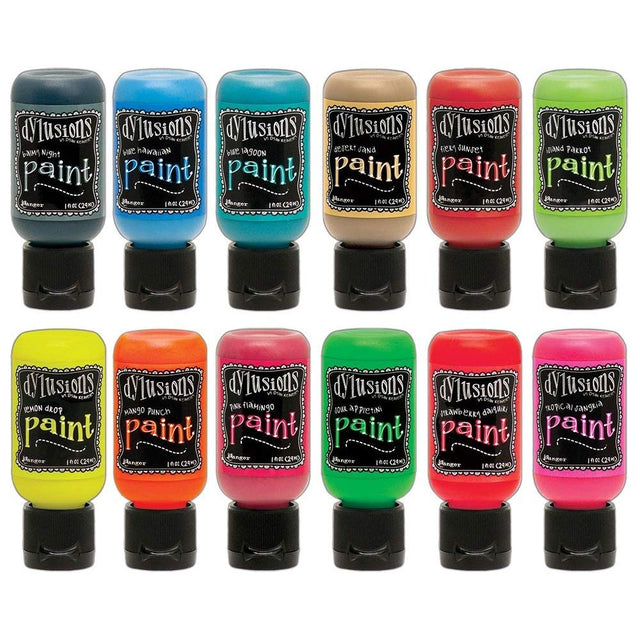 Dylusions Paints have had a make over! The same paints you know and love are now available in 1 oz flip cap bottles! Developed with the art journaler in mind, all paints in the Dylusions assortment are easily blendable yet waterproof, dry quickly to a matte finish, and are compatible with the complete line of Dylusions Ink Spray. Available in 1 oz flip cap bottles. And Introducing twelve new Dylusions paint colors. Six colors coordinate with the newest Dylusions Ink Sprays amd six are vibrant brights! Developed with the art journaler in mind, all paints in the Dylusions assortment are easily blendable yet waterproof, dry quickly to a matte finish, and are compatible with the complete line of Dylusions Ink Spray. Available in 1 oz flip cap bottles. January 2020: Balmy Night, Blue Hawaiian, Blue Lagoon, Desert Sand, Fiery Sunset, Island Parrot, Lemon Drop, Mango Punch, Pink Flamingo, Sour Appletini, Strawberry Daiquiri, and Tropical Sangria.