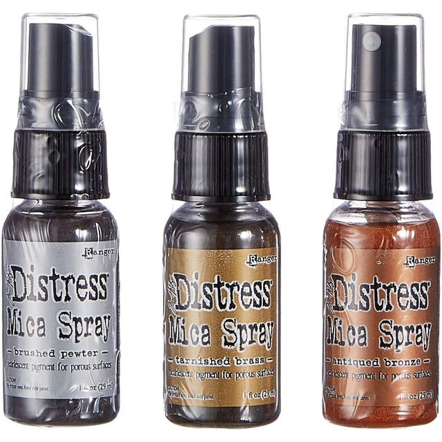Ranger Tim Holtz Distress Mica Spray Set 3 Piece- Add pearlescent shimmer to any paper craft or mixed media project. Mica pigment sprays adhere to most non-porous surfaces such as paper, canvas, wood and fabric. Use as a finishing spray or layer over inks and