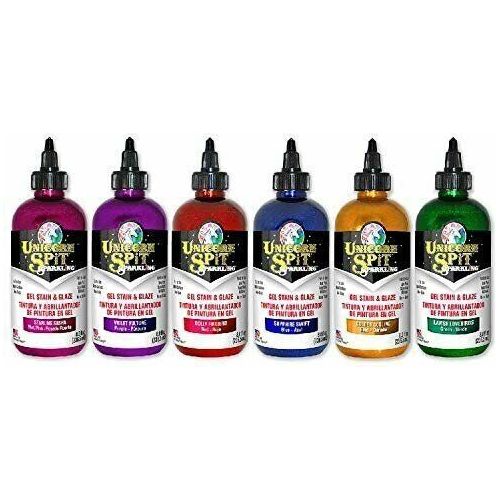 It's here - the Spit you've been waiting for! Unicorn Spit Sparkling Paint - it will add Sparkle to your Projects! UNICORN SPIT GEL STAIN AND GLAZE IN ONE! UNICORN SPiT allows anyone to turn ordinary objects into personalized MASTERPIECES! Use on wood, glass, metal, fabric, pottery, wicker, concrete and laminate. Ideal for creating new - or - refinishing thousands of projects. Excellent for Crafters, Makers, Hobbyists, DIYers and Pros too! What makes UNICORN SPiT so special? It can be used as a PAINT or dilute it with water to create a GEL, GLAZE, STAIN, WHITE WASH or ANTIQUING TINTWhat substrates does UNICORN SPiT work on? Wood, Glass, Metal, Fabric, Pottery, Wicker, Concrete, Laminate and more! Can UNICORN SPiT be used outdoors? Yes. Make sure to protect your masterpiece first with finishes/coatings that are oil-based. Water-based coatings will alter the look of Unicorn SPiT. For a high gloss finish, seal with Famowood Glaze Coat. For better protection and a higher gloss, repeat coats of sealer as indicated on the products instructions. High Gloss Sealers will help achieve a three dimensional look. Will UNICORN SPiT applied to fabric be water resistant and machine washable? Yes, but it must be treated first. Use a product intended for waterproofing fabric after Unicorn SPiT has completed dried. Can custom colors be created? Yes. Mix Unicorn SPiT colors together to create your own special color OR mix most any water-based paint (chalk style or mineral based) with Unicorn SPiT to create custom colors.